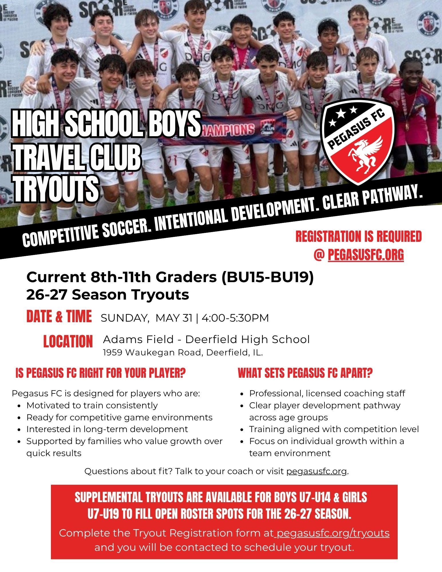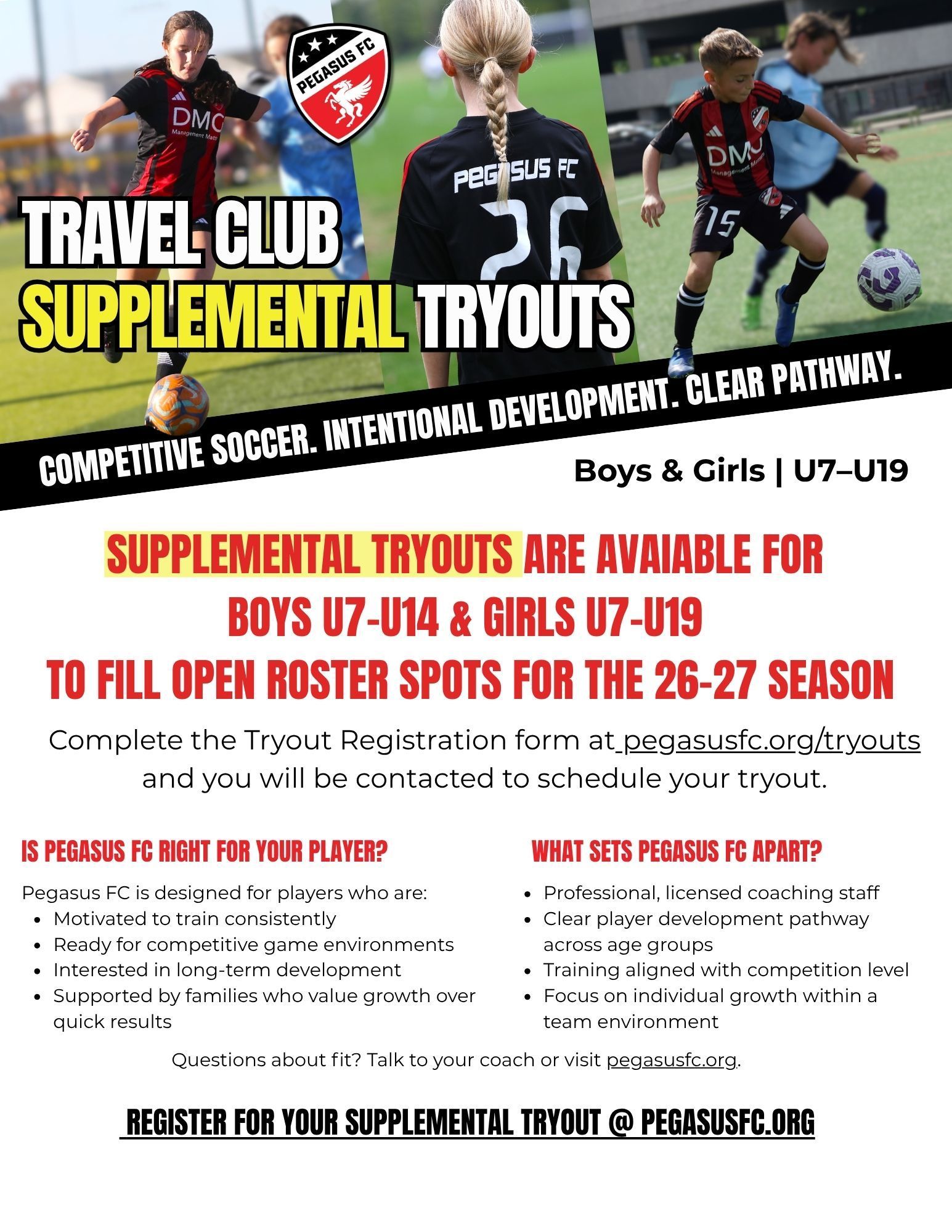 In order to receive an invitation to join our club and be rostered on a Pegasus FC team for the 2026/2027 season, all players will need to complete a Tryout Registration using the link above . Once a tryout registration has been completed for your player, you will be contacted to schedule a date and time for your player to be evaluated at a Supplemental Tryout Session.
